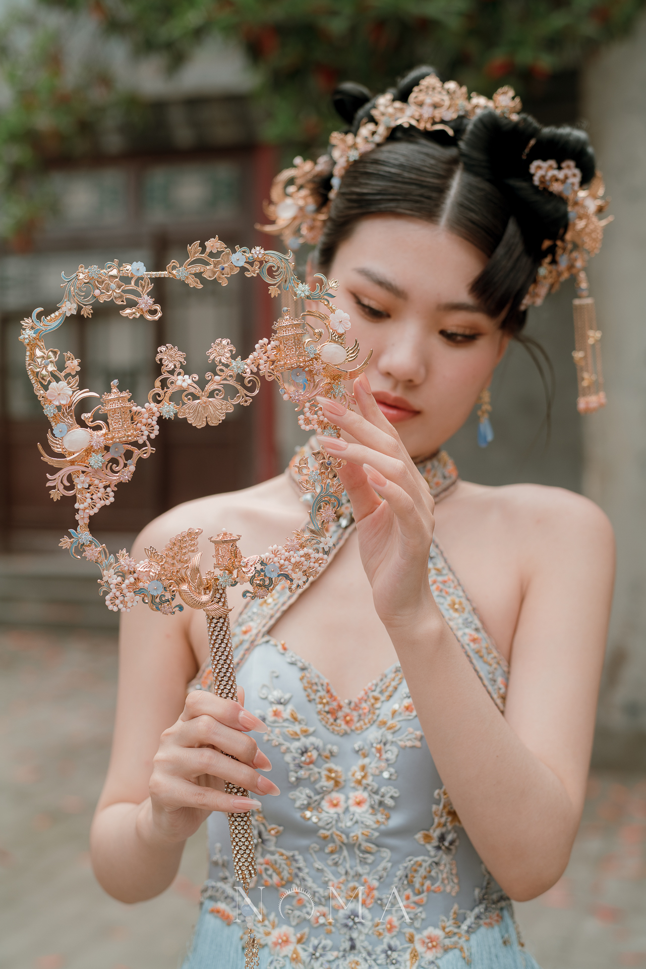 Harmonious Peacock Crane Pagoda Ornament Fan – Gold, Pink