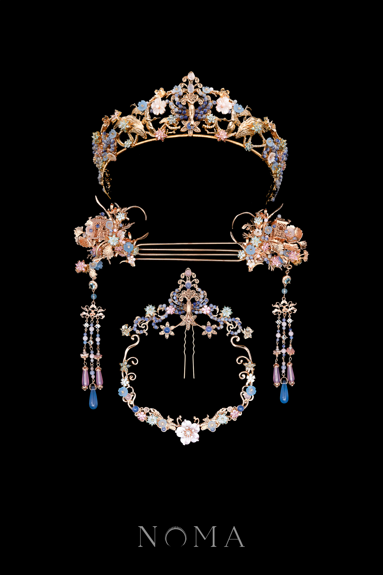 Peacock Ornament Pagoda Ginkgo Grass Full Set – Gold, Blue (5 pcs)