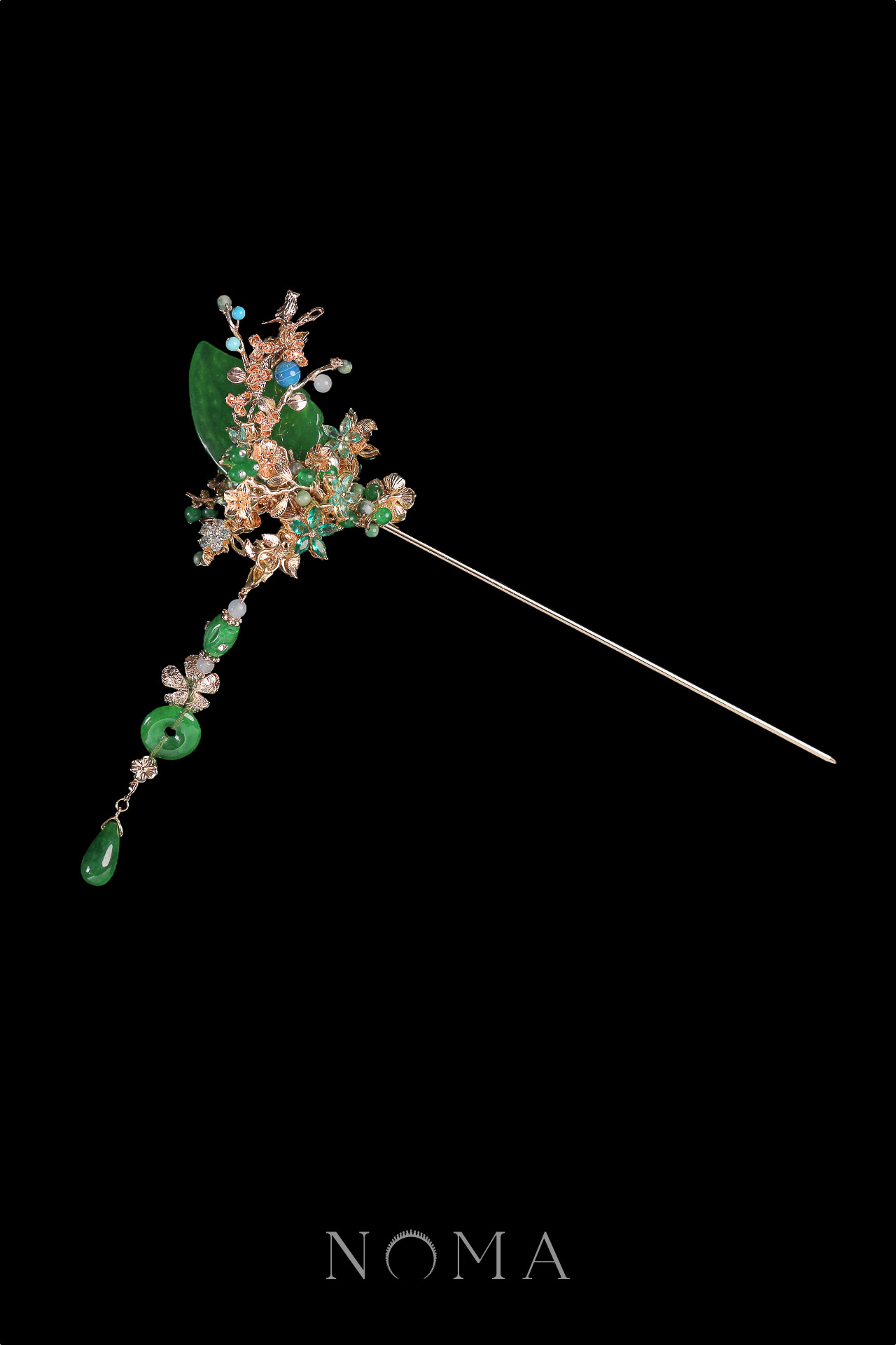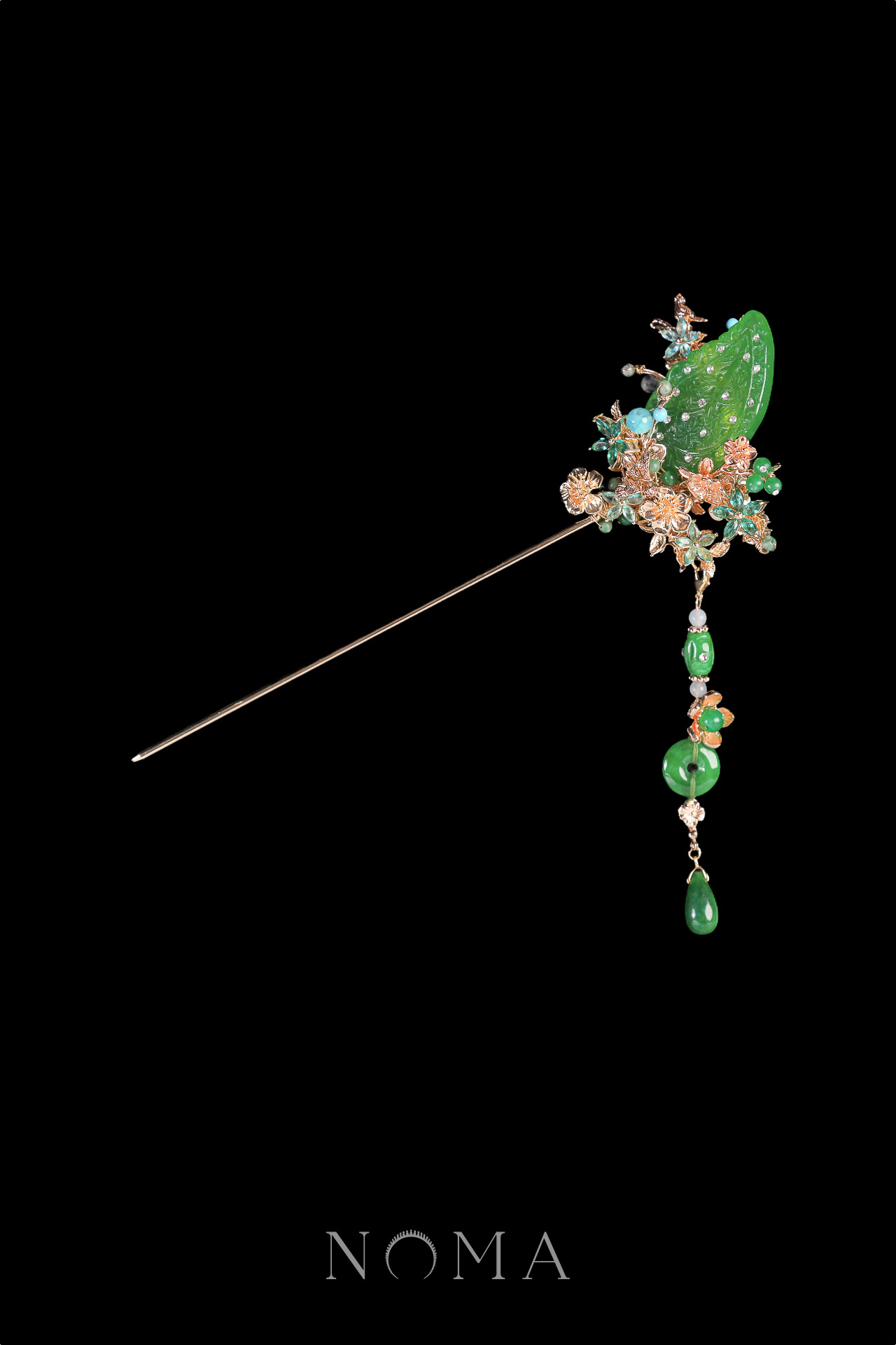 Natural Teardrop Jade Branch Hairpin – Gold, Jade