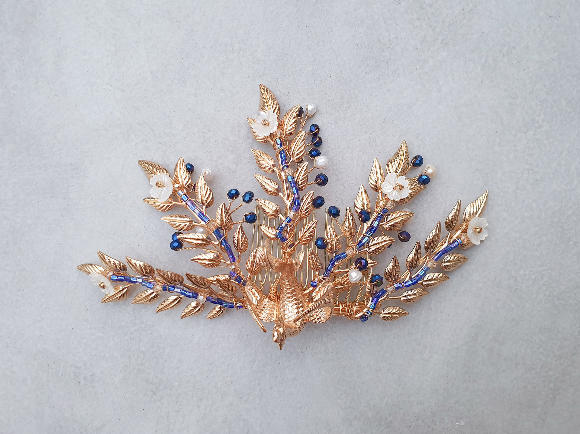 Flamboyant Phoenix Feathers Haircomb – Gold, Navy
