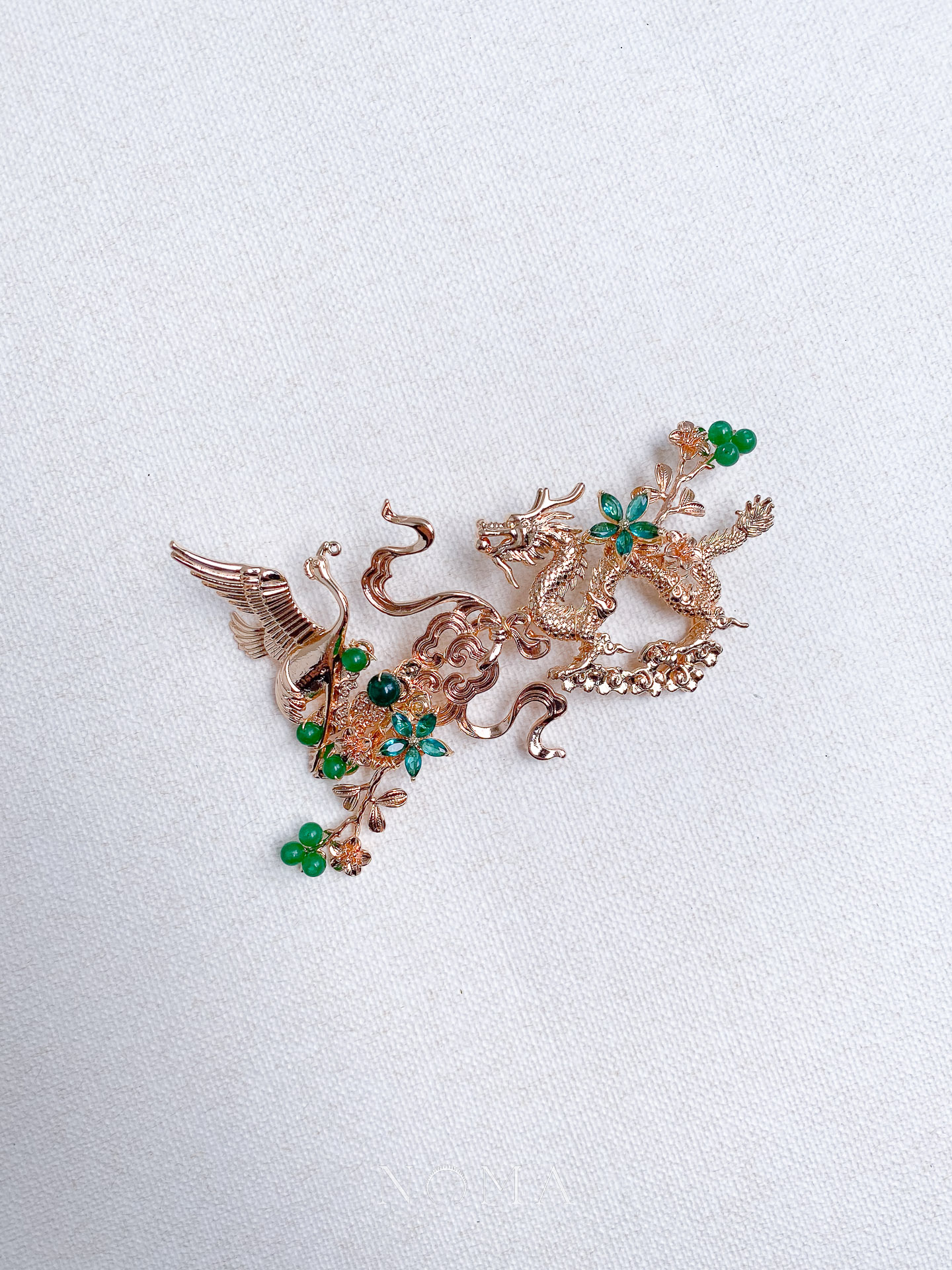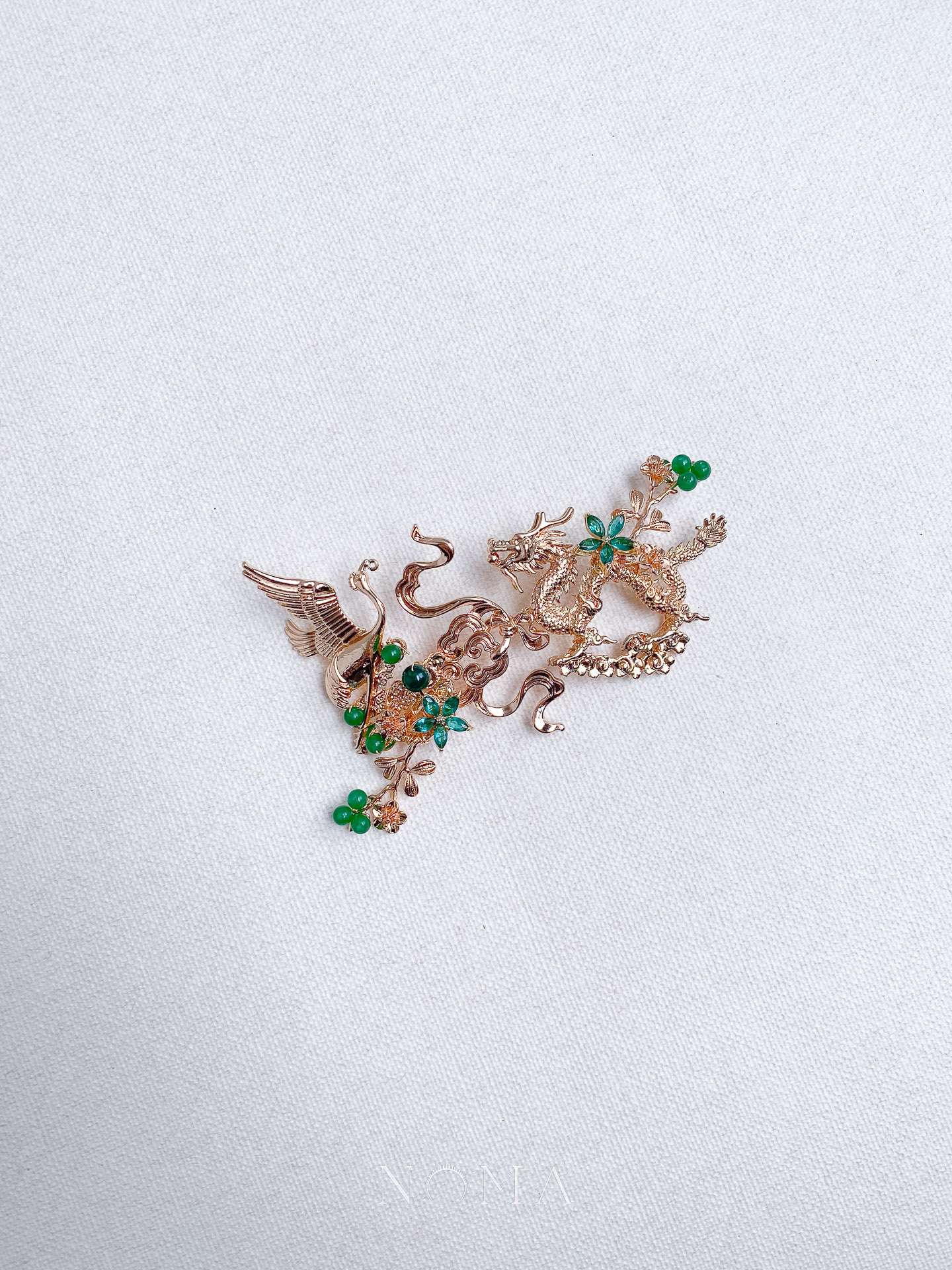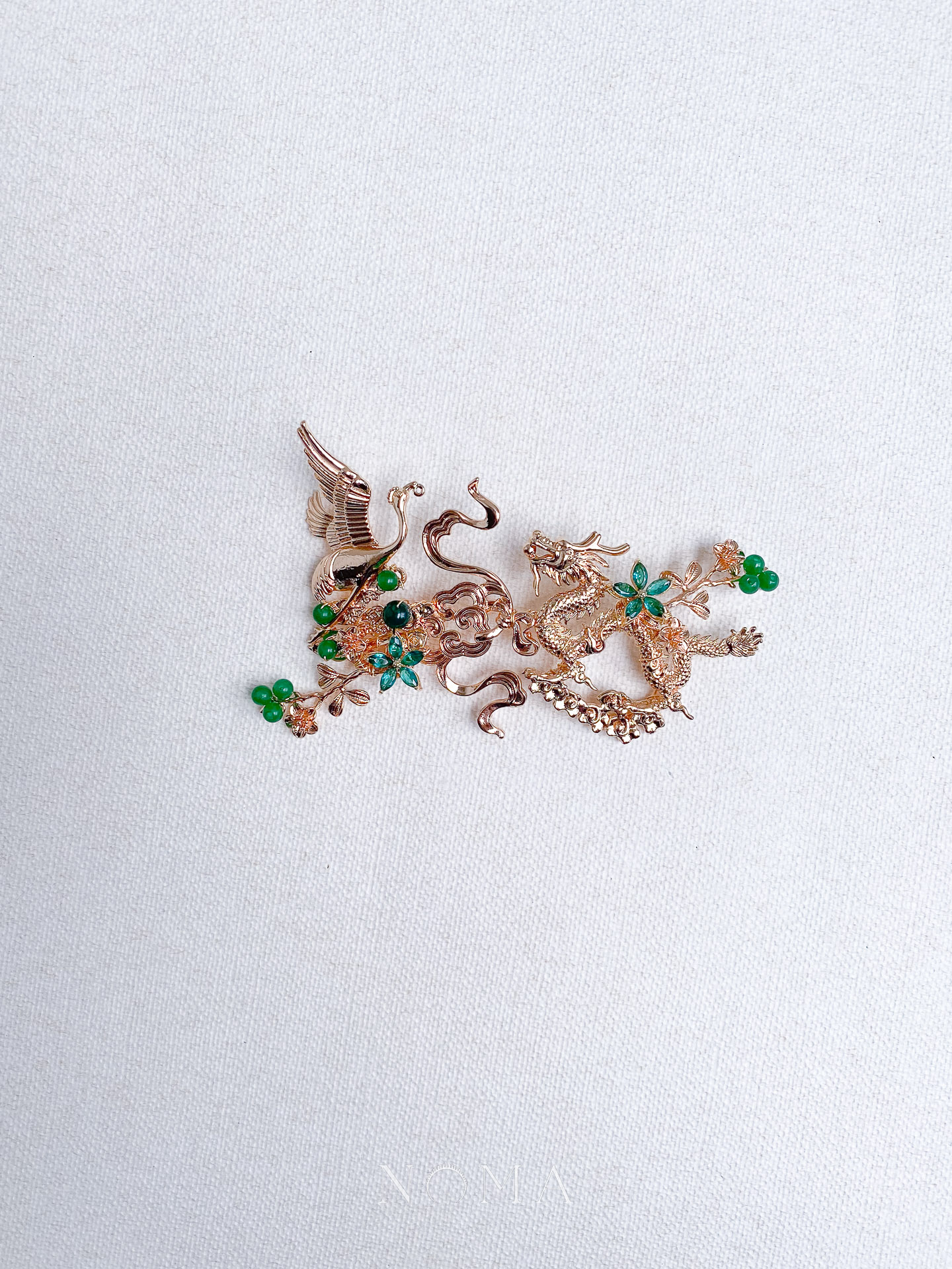 Dragon and Crane Heaven Hairvine – Gold, Emerald (Left)