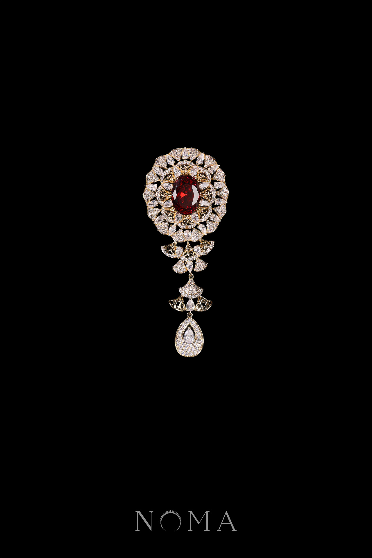 Dangling Oval Radiant Brooch – 18k Yellow Gold, Ruby
